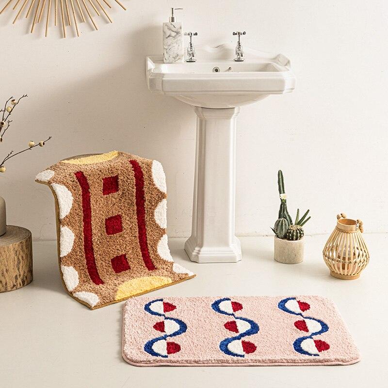 Deze badmat is niet alleen mooi om naar te kijken, hij is ook ontzettend praktisch. Gemaakt van zacht en absorberend materiaal, voelt hij heerlijk aan onder je voeten na een warme douche of bad. De unieke combinatie van bruine tinten met crèmekleurige stippen en rode vierkanten zorgt voor een speelse, maar toch elegante look die naadloos past in verschillende interieurstijlen, van modern tot landelijk. Het is de ideale manier om je badkamer een snelle en betaalbare make-over te geven.