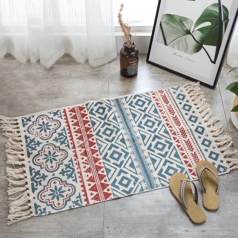 Transformeer de look van je slaapkamer met deze prachtige decoratieve loper, perfect om naast het bed te plaatsen. Deze loper voegt niet alleen een vleugje warmte en comfort toe aan je interieur, maar beschermt ook je vloer. Met zijn levendige patroon van blauwe en rode geometrische vormen en bloemmotieven aan de uiteinden, brengt deze loper een bohemian en gezellige sfeer in elke kamer. Stel je voor dat je 's ochtends wakker wordt en je voeten op deze zachte textuur laat rusten, in plaats van op een koude vloer. Het is de perfecte manier om je dag comfortabel te beginnen!