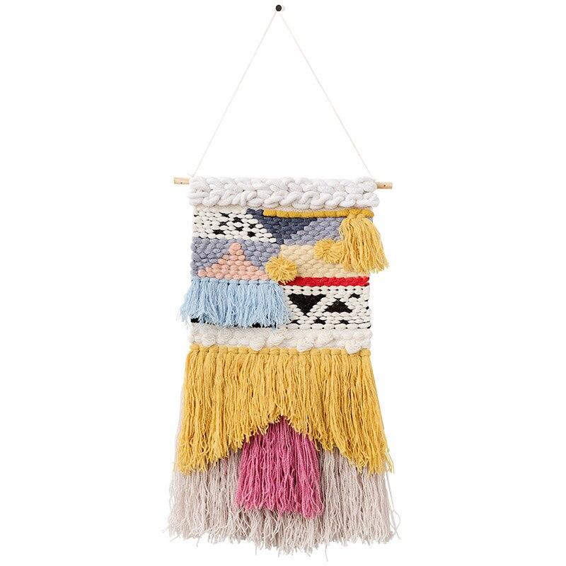 Dit prachtige wandkleed is meer dan alleen decoratie; het is een statement. De zorgvuldig geselecteerde garens in diverse texturen en kleuren, zoals zachtblauw, mosterdgeel, levendig roze en neutrale tinten, vormen samen een harmonieus geheel. Het reliëf in het weefsel, met knopen en pluizige elementen, nodigt uit om aangeraakt te worden en geeft diepte aan je muur. Elk stuk is met liefde en vakmanschap gemaakt, wat resulteert in een item dat zowel robuust als verfijnd is. Voel de kwaliteit en zie het verschil dat een handgeweven stuk maakt in je interieur.