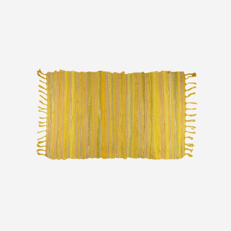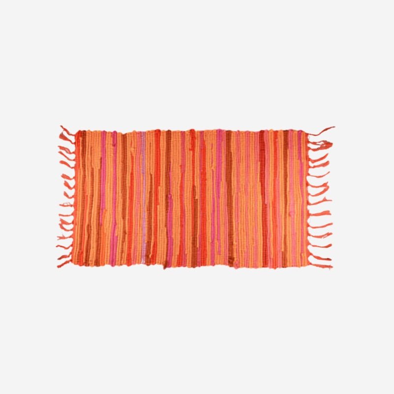 Deze unieke gekleurde geweven deurmat met franjes is een ware blikvanger. Het zorgvuldige weefwerk van diverse katoenen stoffen creëert een rijk kleurenpalet dat varieert van zacht geel en levendig oranje tot kalmerend blauw en diep paars. De ambachtelijke kwaliteit is voelbaar in elke draad, waardoor de mat niet alleen visueel aantrekkelijk is, maar ook heerlijk zacht aanvoelt onder je voeten. De speelse franjes aan elk uiteinde voegen een extra vleugje bohemien charme toe, waardoor deze mat een perfecte aanvulling is op een huis dat warmte, gezelligheid en een beetje eigenzinnigheid uitstraalt. Laat deze mat het verhaal van jouw unieke stijl vertellen.