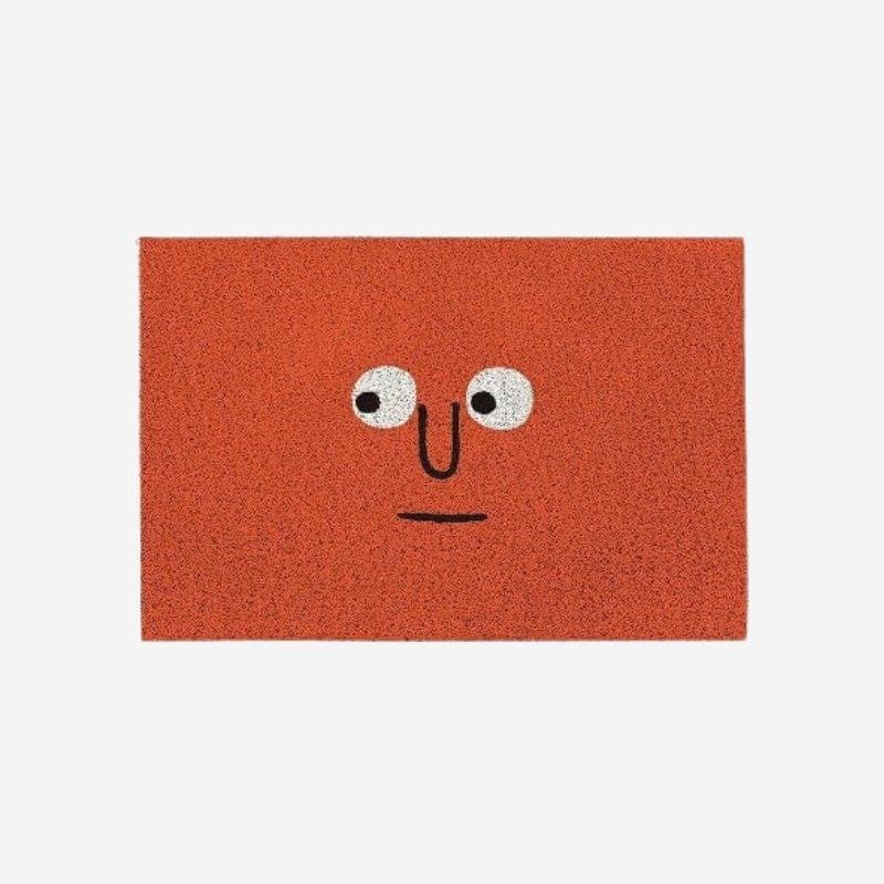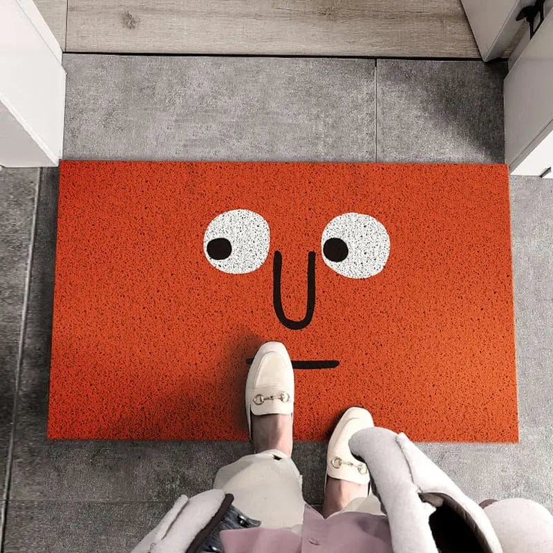 Grappige rode deurmat met gezicht: Een vrolijke verwelkoming
