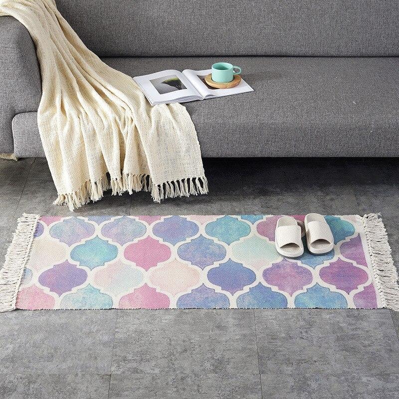 Dit vloerkleed is niet alleen een lust voor het oog, maar ook ontzettend praktisch. De combinatie van zachte pastelkleuren zoals paars, roze, blauw en mintgroen zorgt voor een harmonieus geheel dat gemakkelijk te combineren is met verschillende interieurstijlen. Of u nu een minimalistische inrichting heeft die een pop van kleur kan gebruiken, of een bohemien stijl waar dit kleed naadloos in past, het zal zeker de aandacht trekken. De franjes aan de uiteinden geven het een extra speelse touch en een ambachtelijke uitstraling. Plaats het voor uw bank, onder een salontafel, of zelfs in een hal om een gastvrije entree te creëren. Dit kleurrijke woonkamer vloerkleed met patroon is een echte sfeermaker!