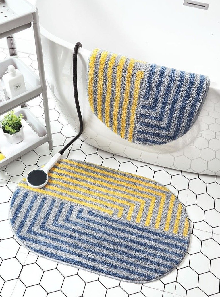 Geometrische Ovale Badmat in Geel en Blauw: Stijl en Comfort voor Jouw Badkamer